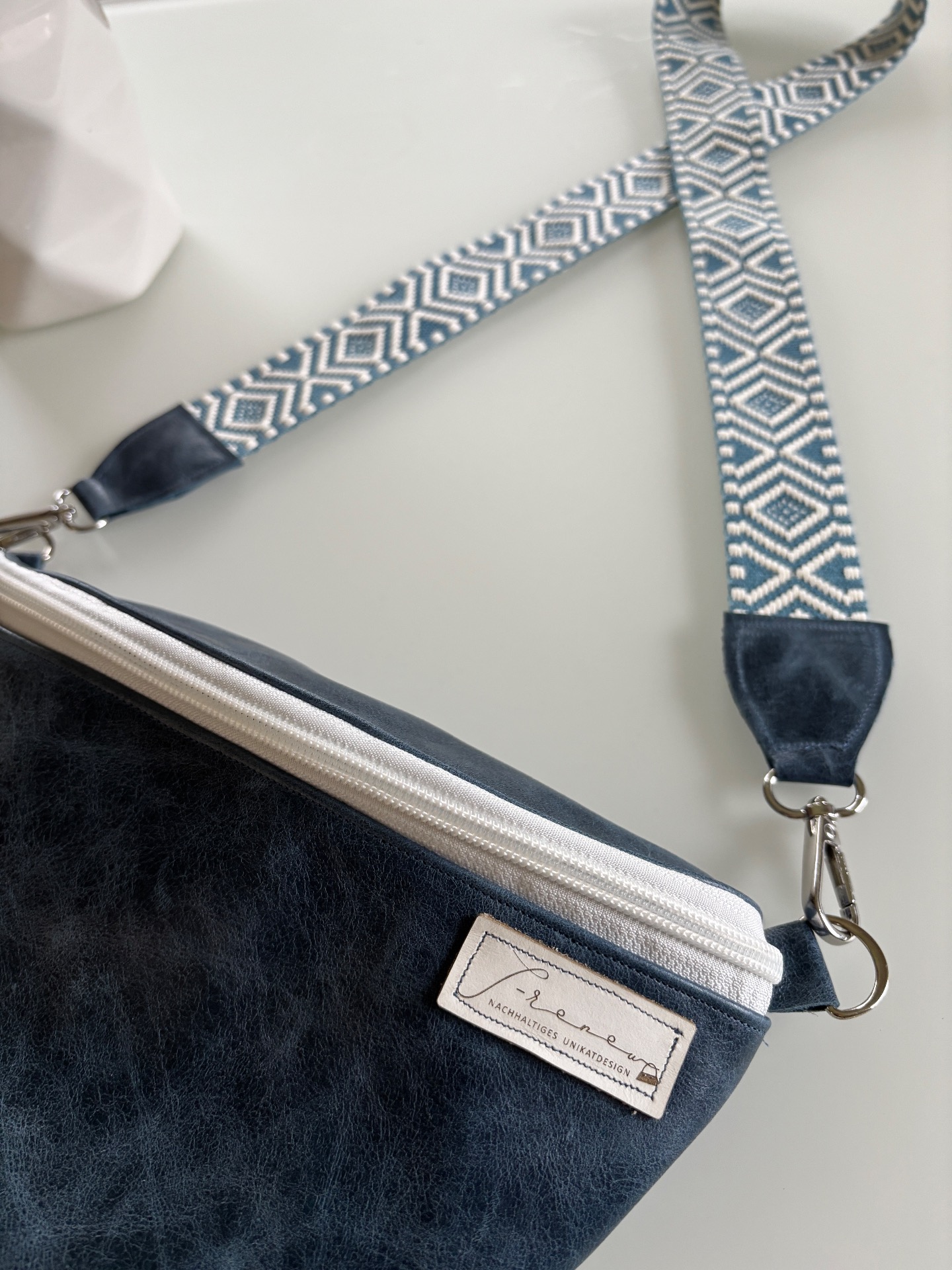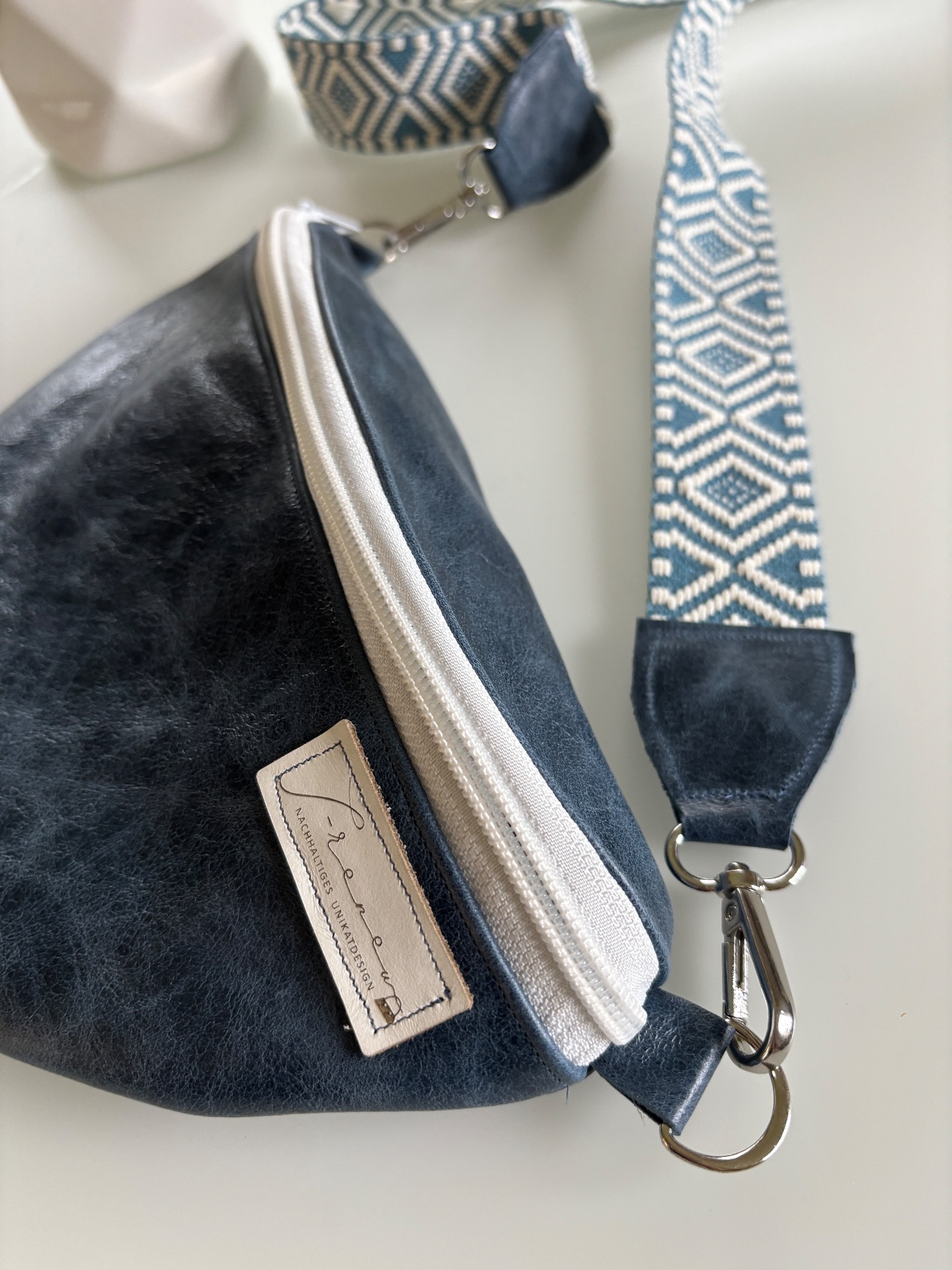 Ein echtes Unikat aus nachhaltiger Produktion: Die Belly-Renew besteht aus hochwertigem, schwarzem Echtleder – auf der Vorderseite dezent schimmernd für einen eleganten Look.