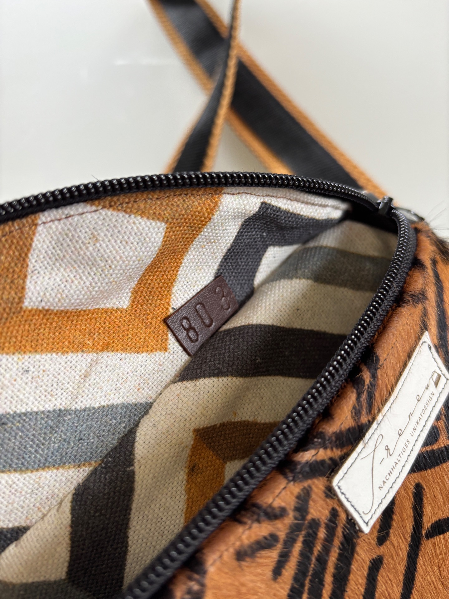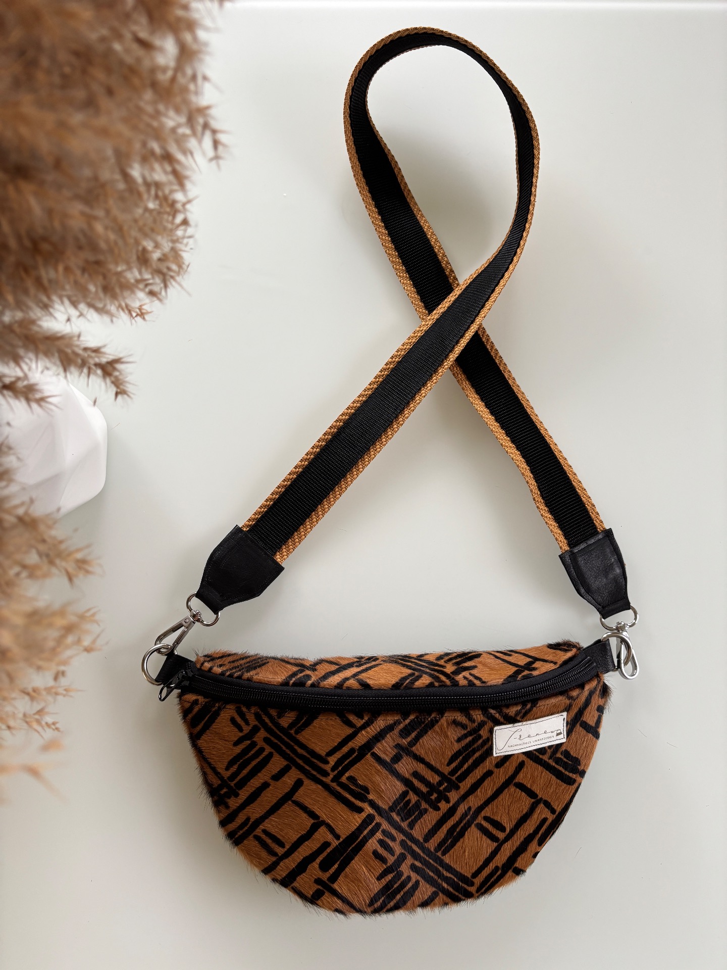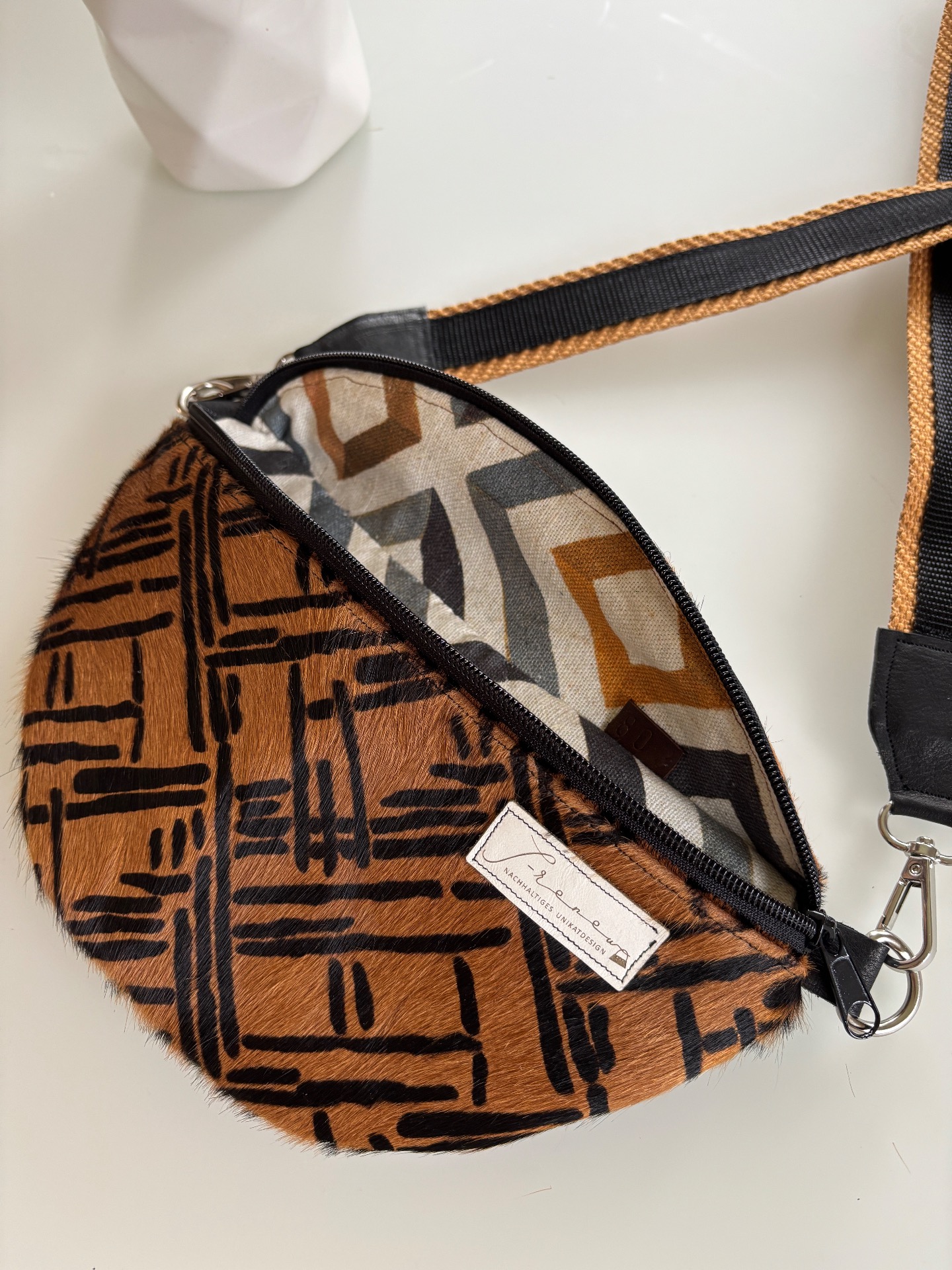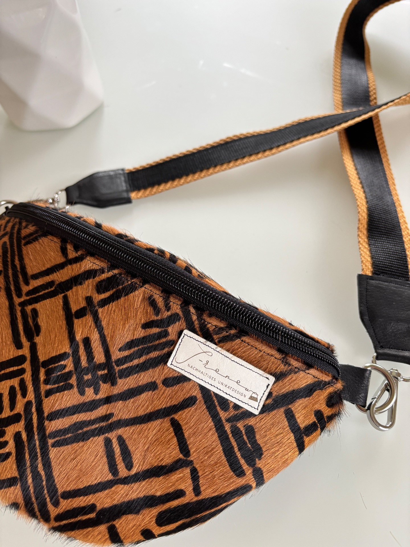 Ein echtes Unikat aus nachhaltiger Produktion: Die Belly-Renew besticht durch ihr außergewöhnliches Design aus hochwertigem, braun-schwarzem Leder mit auffälligem Muster. Die Vorderseite schimmert dezent und verleiht der Tasche einen eleganten, modernen Look.