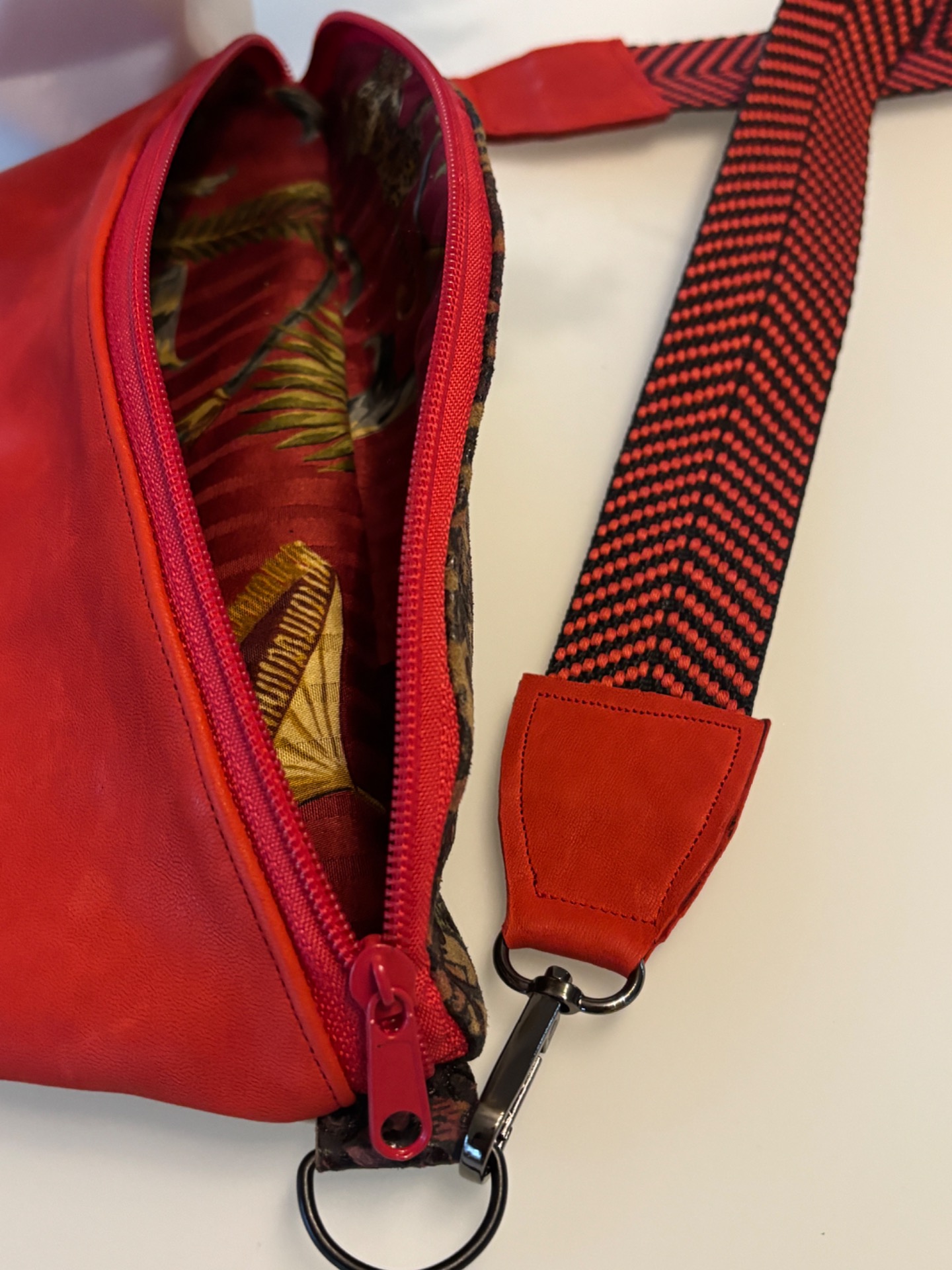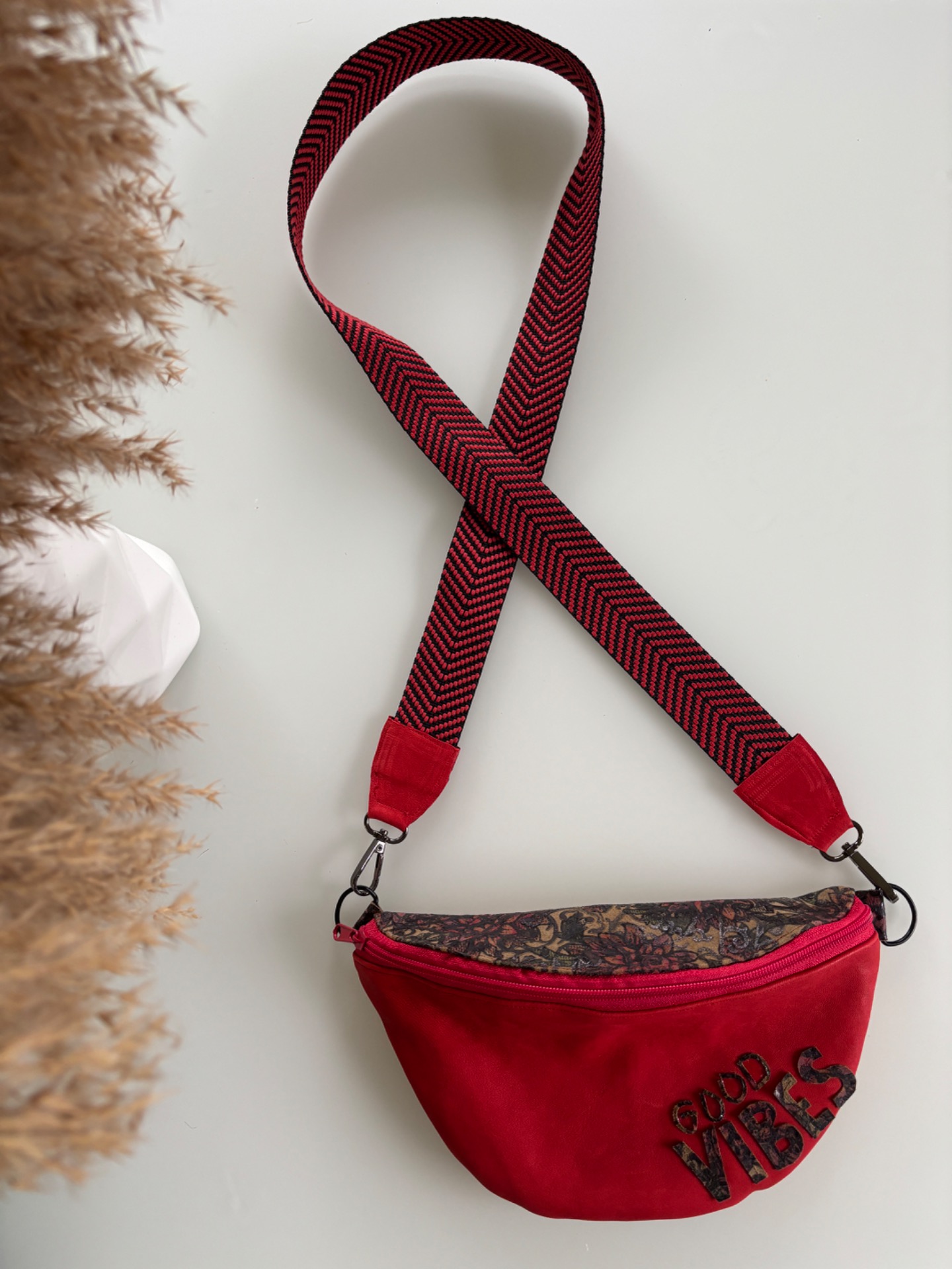 Ein echtes Unikat aus nachhaltiger Produktion: Die Belly-Renew besticht durch ihr außergewöhnliches Design aus hochwertigem Leder mit auffälligem Muster, in rot und beige. Die Vorderseite besticht durch aufgenähte Buchstaben verleiht der Tasche den „Good vibes“ Look.