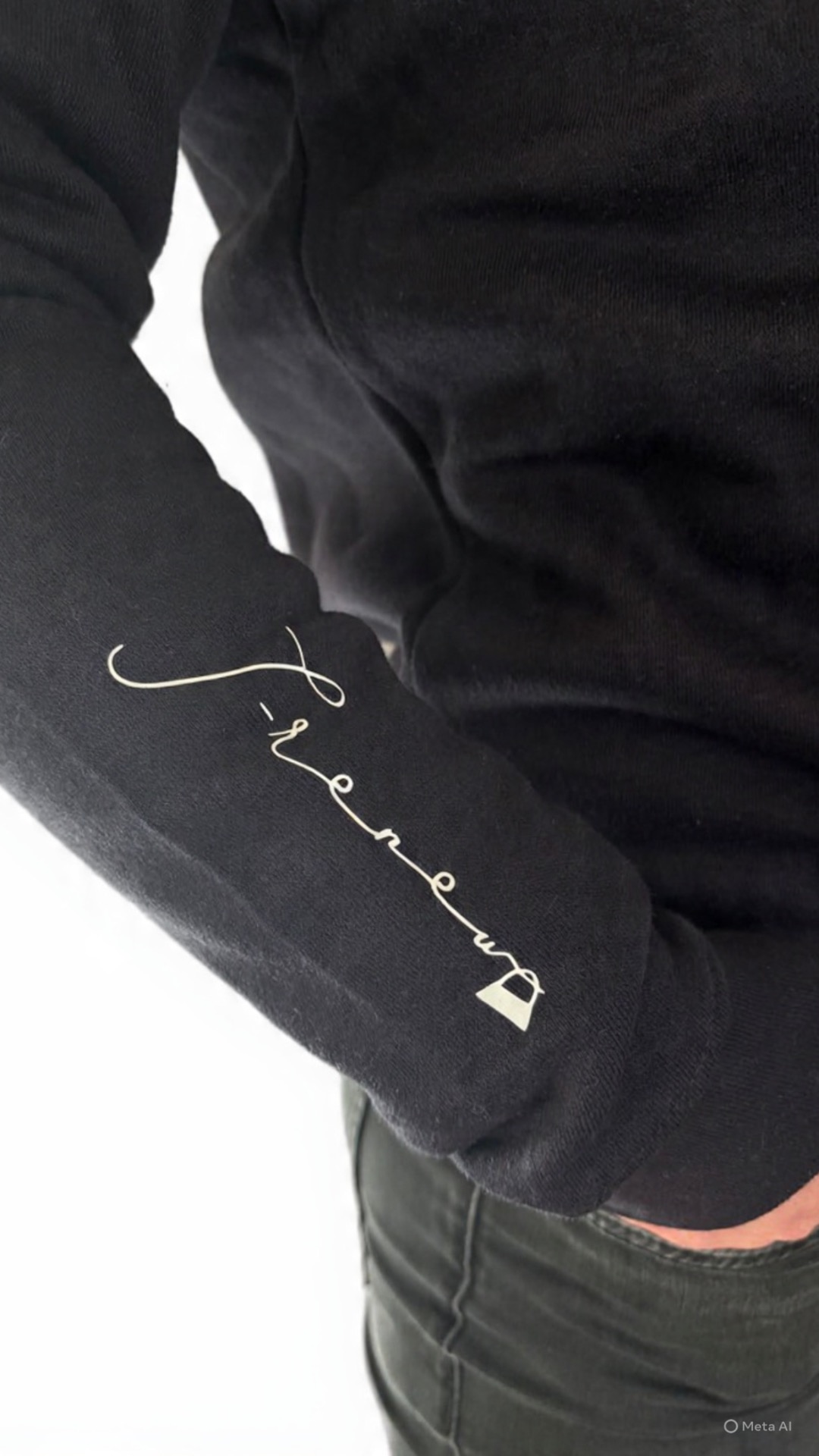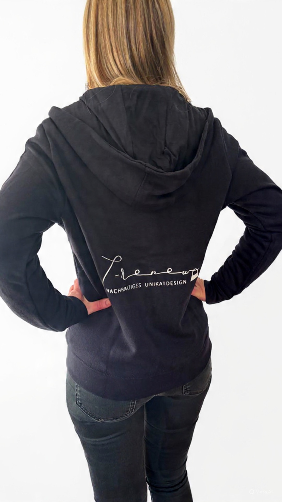 Der einfarbige, dunkelblaue Sweatstoff verleiht der Weste eine zeitlose Ausstrahlung und macht sie zu einem vielseitigen Begleiter für jede Gelegenheit. Der dezente Schriftzug "Nachhaltiges Unikatdesign" setzt ein bewusstes Statement für Individualität und Qualität.