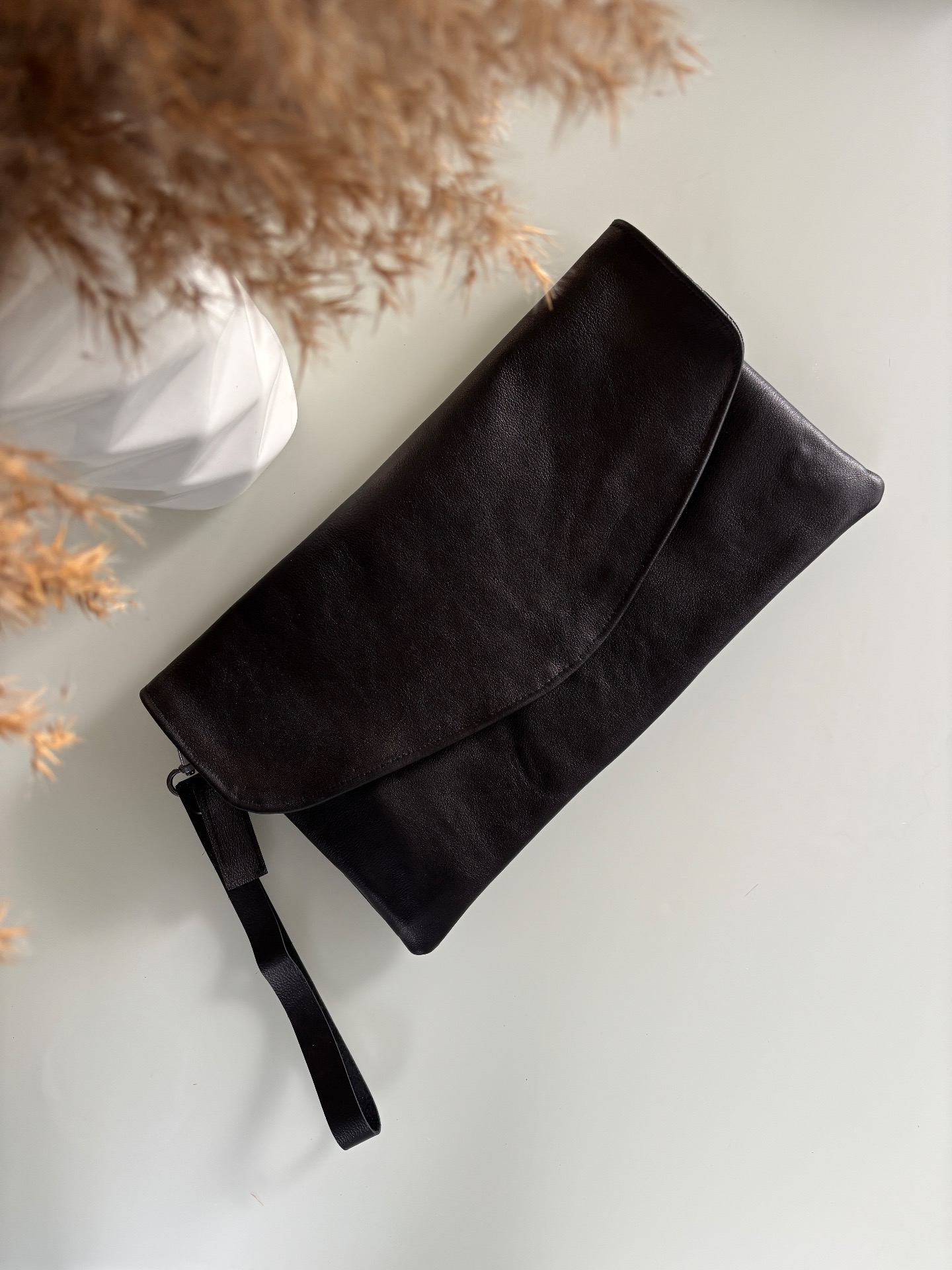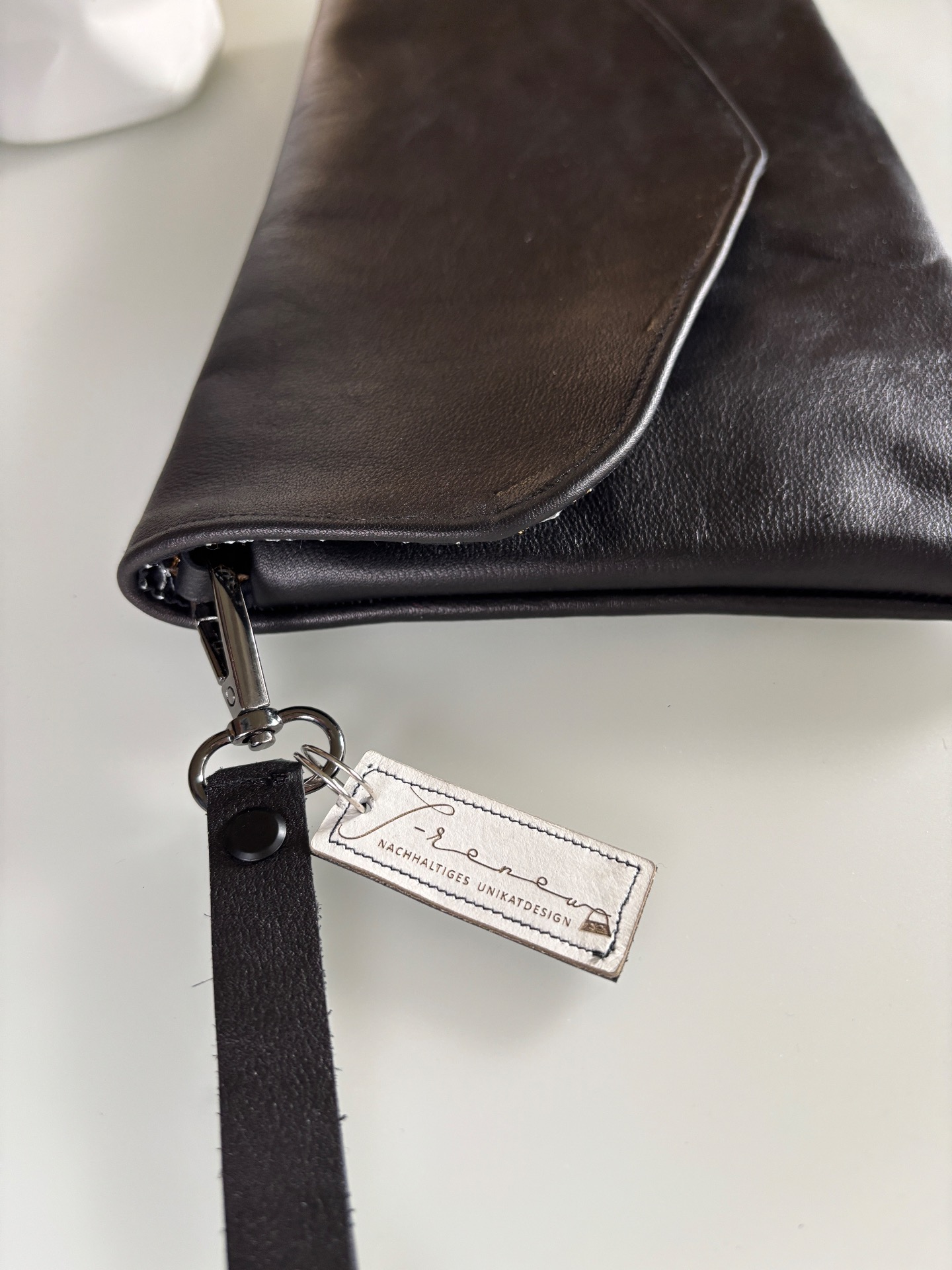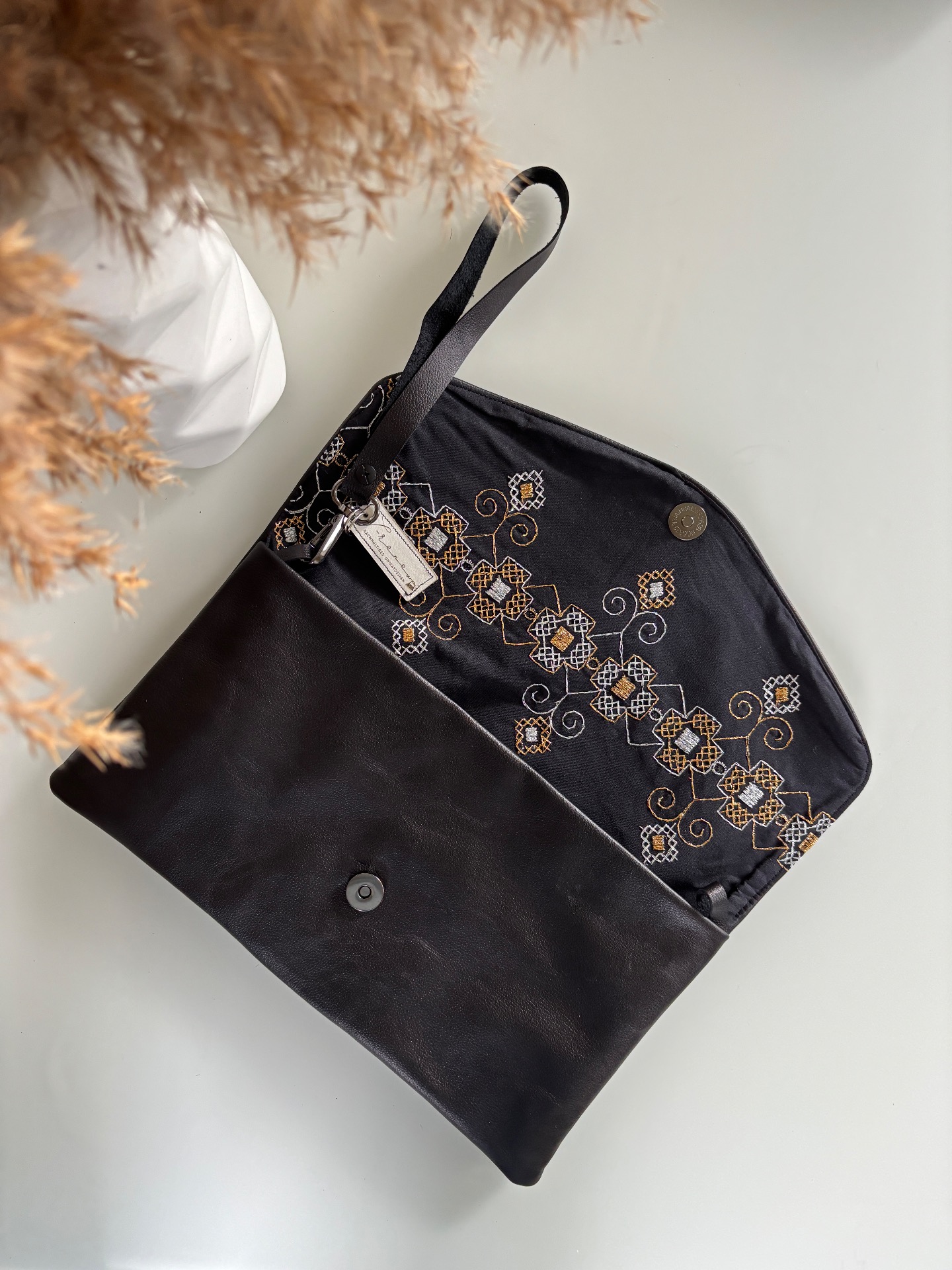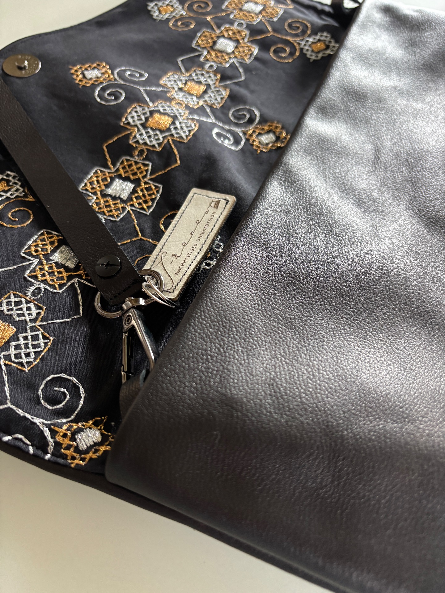 Ein stilvolles Einzelstück für besondere Momente: Clutch aus hochwertigem, schwarzem Leder – außen klassisch und puristisch, innen überrascht sie mit einem kunstvoll bestickten Innenfutter in Gold-, Silber- und Bronzetönen.