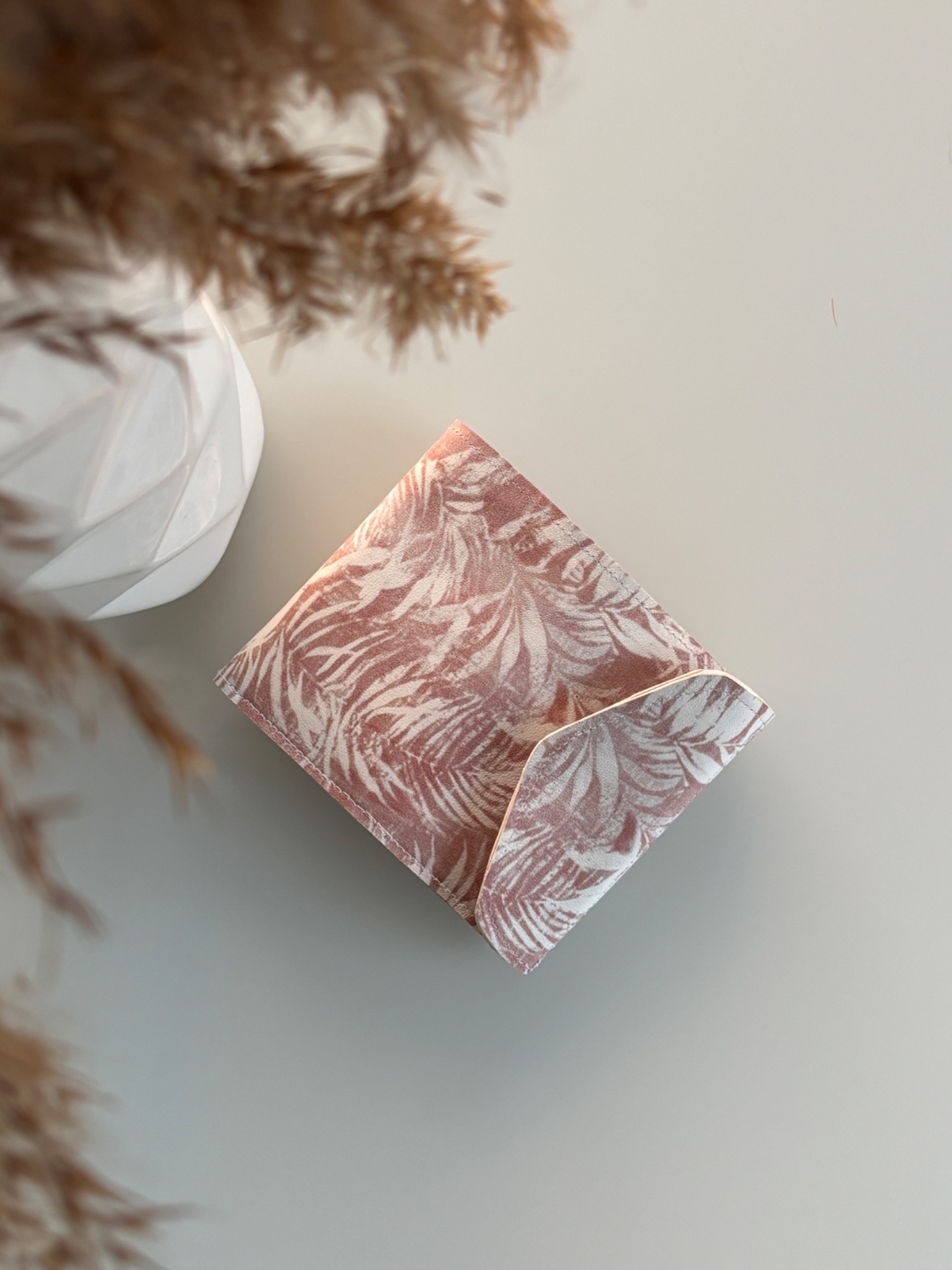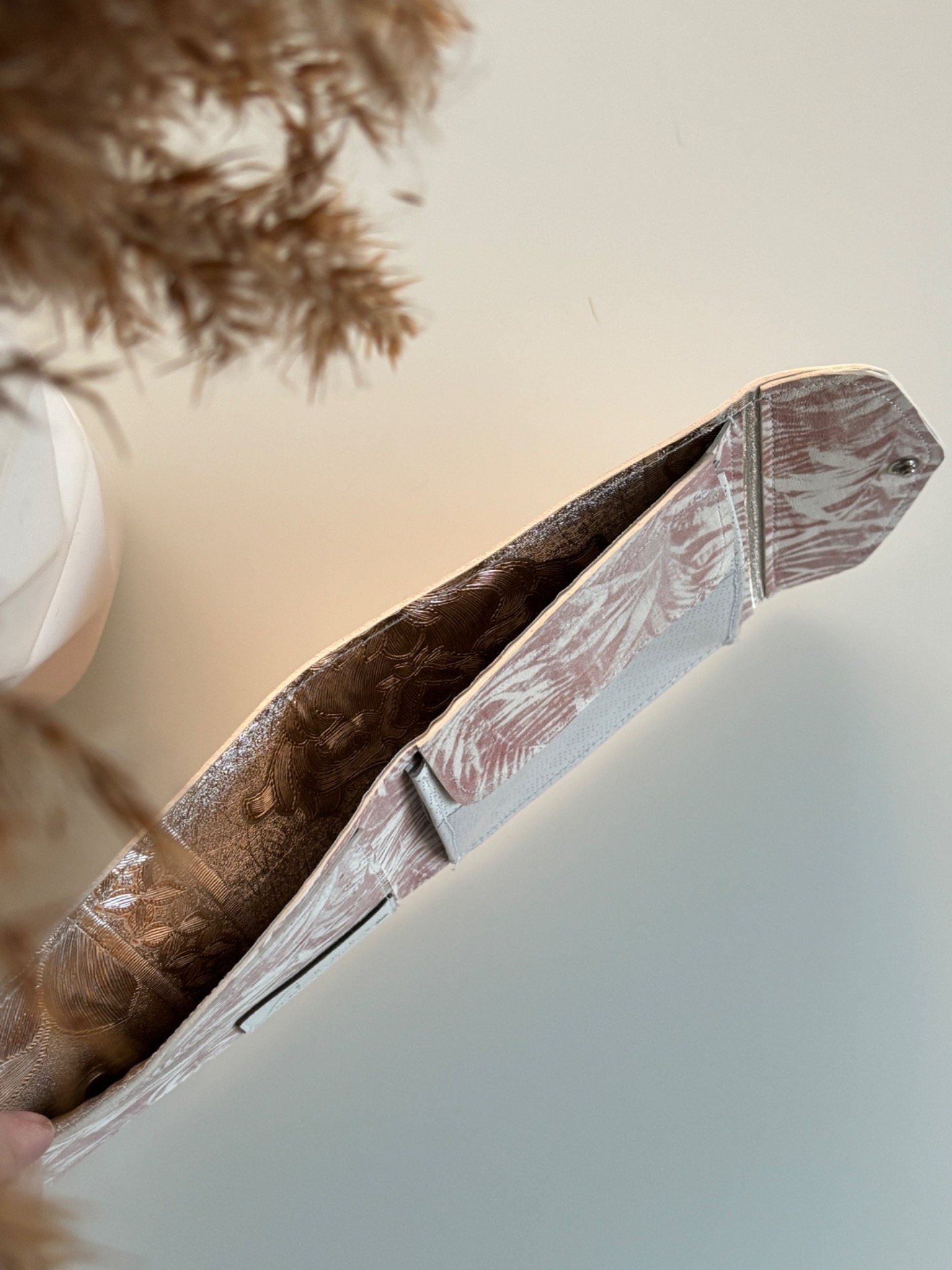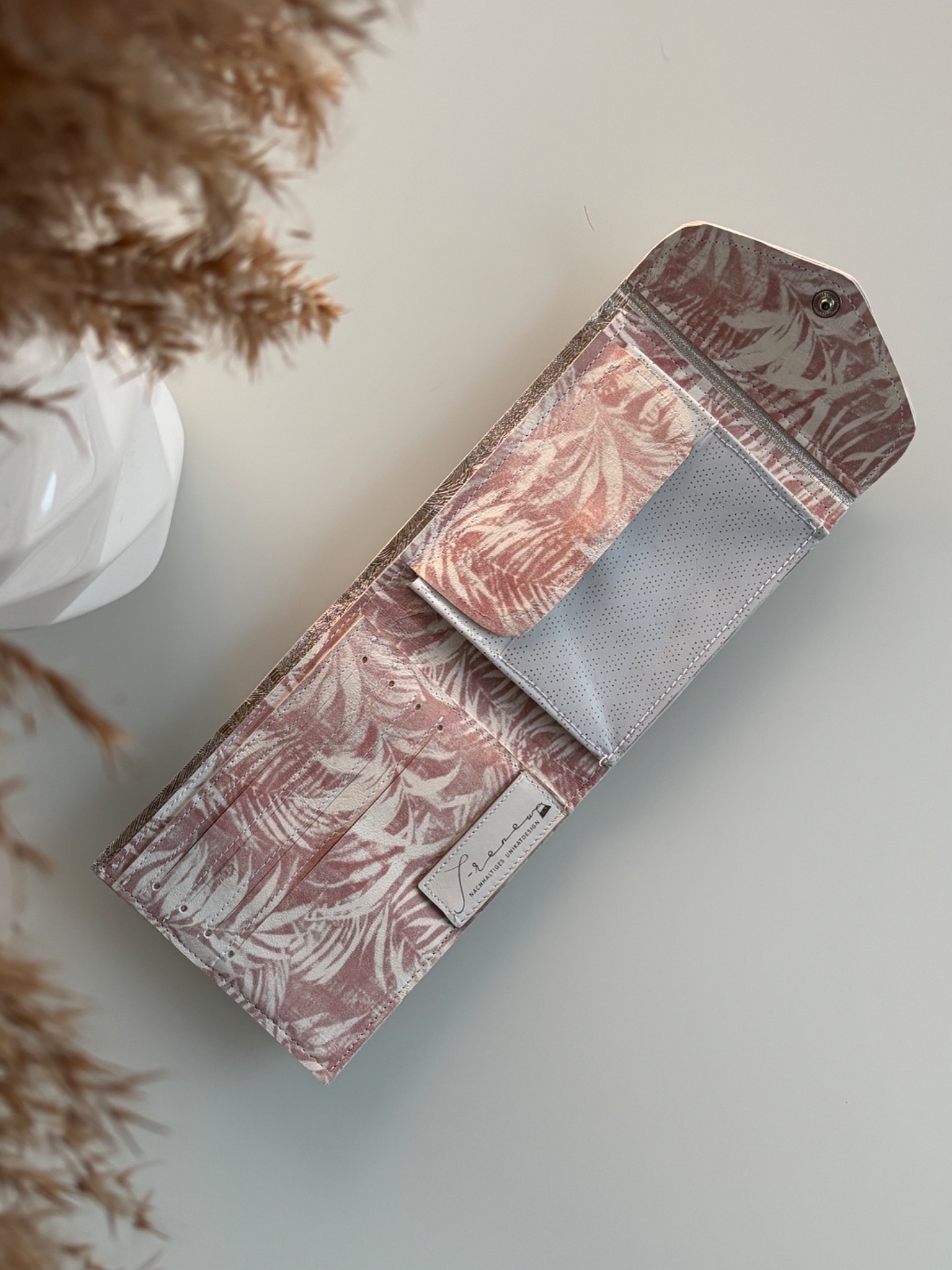 • Aus rosa Echtleder in floralem Design